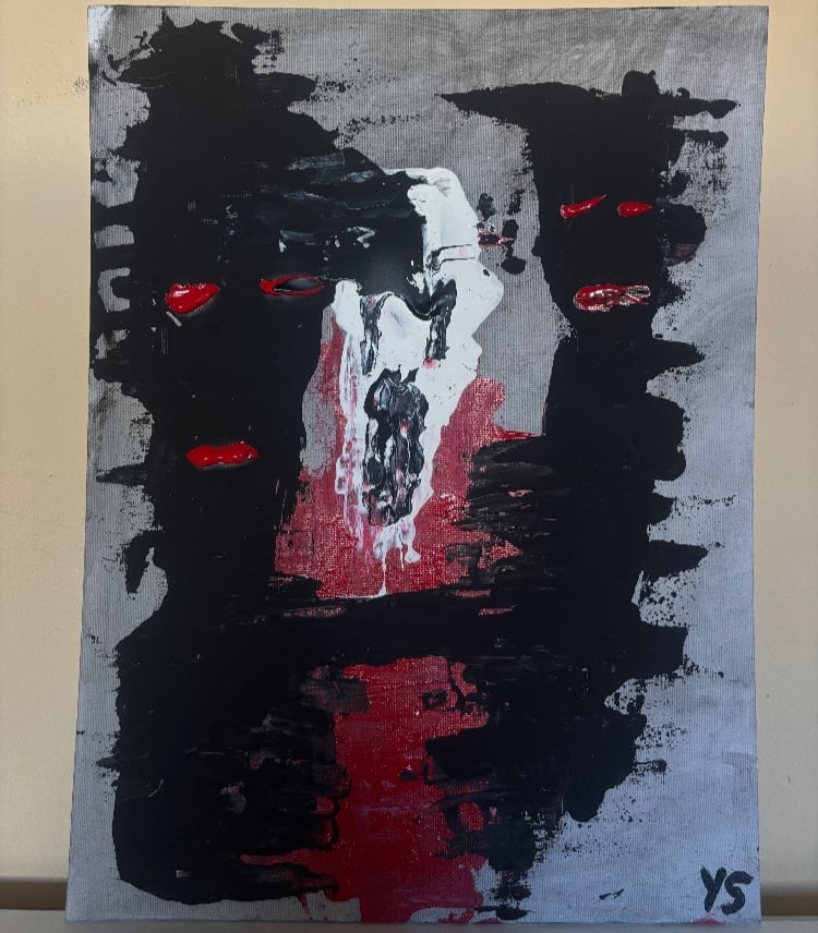 La figura bianca al centro è la parte di sé che finalmente trova il coraggio di uscire, mentre ai lati si stagliano due presenze con gli occhi rossi: una più piccola, simbolo del bambino interiore, e una più grande, incarnazione dei traumi e degli schemi mentali che ancora trattengono.