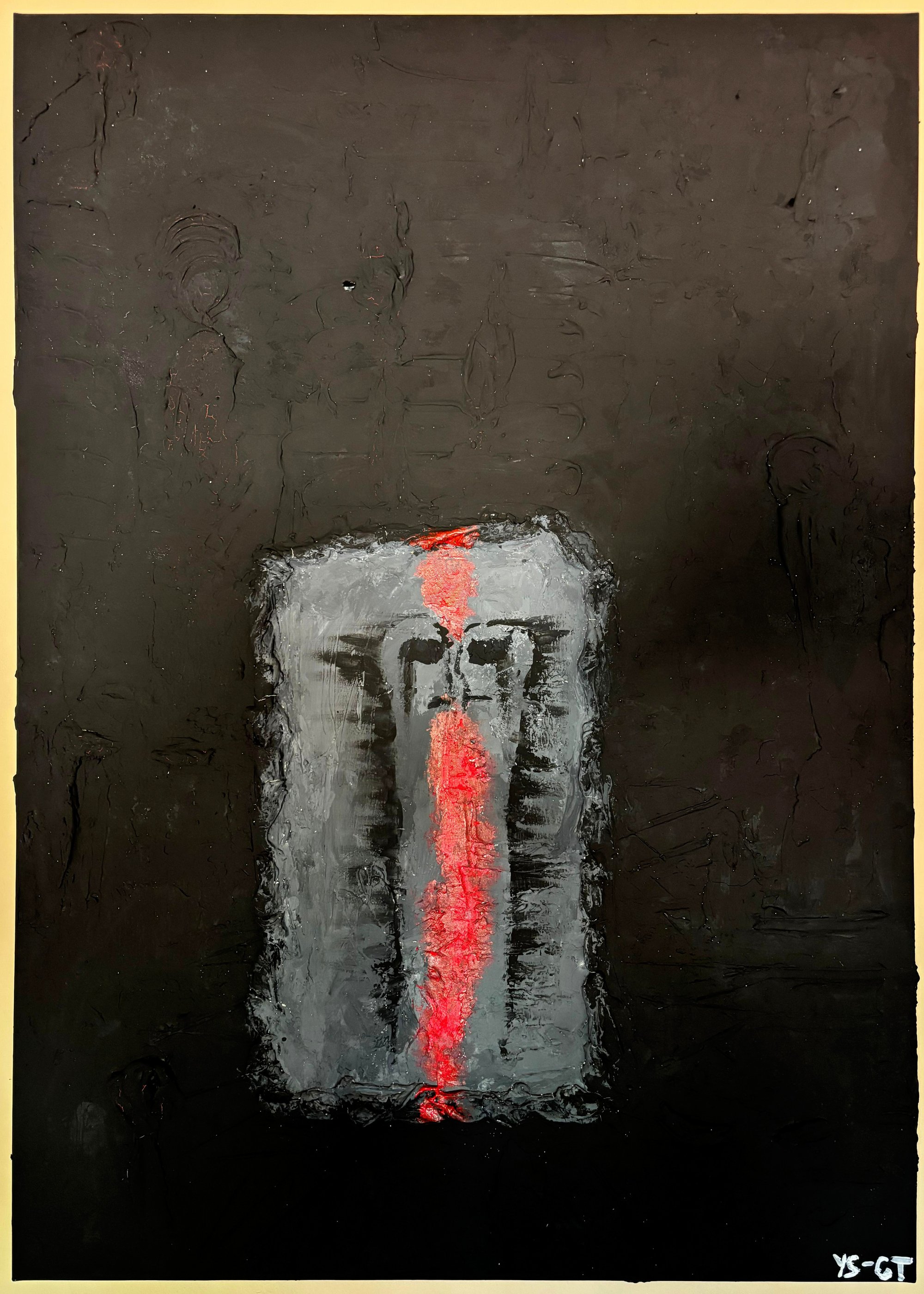 Al centro dell’opera, un rettangolo anche lui in rilievo, come una soglia, come un rifugio.