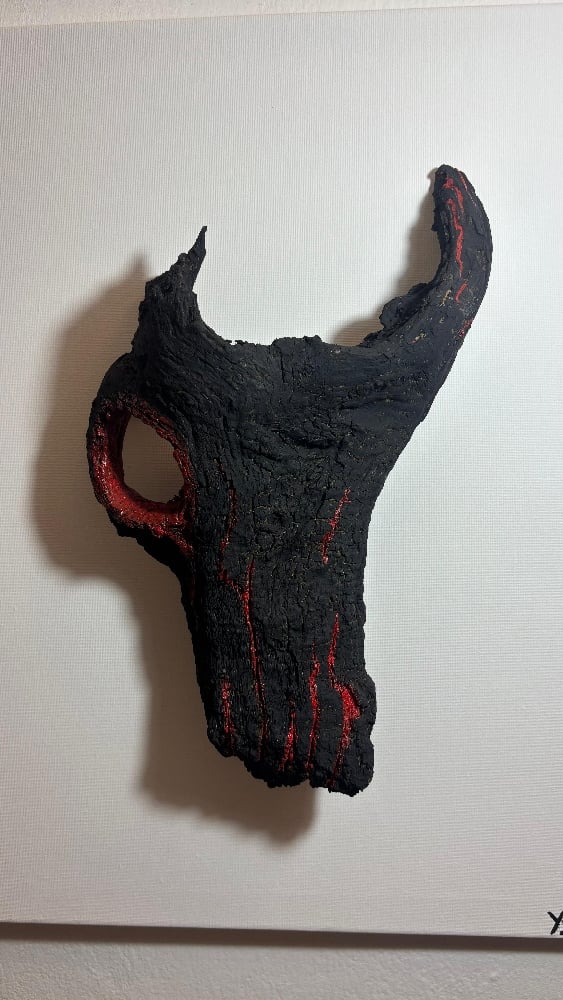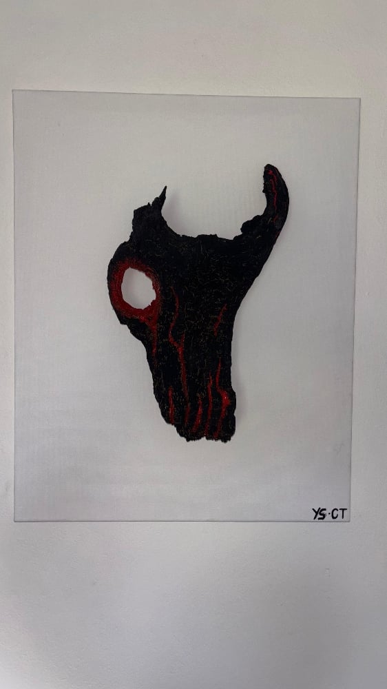 Questa scultura su tela nasce dalla lavorazione manuale di legno naturale, trasformato in una maschera carica di forza simbolica e di energia.